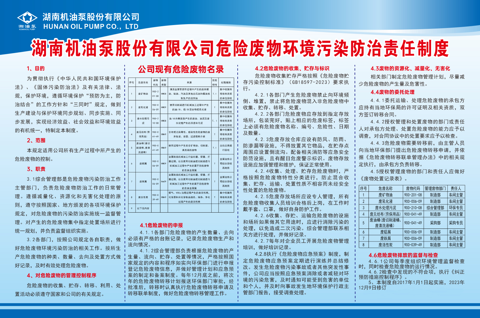湖南機油泵股份有限公司危險廢物環境污染防治責任制度